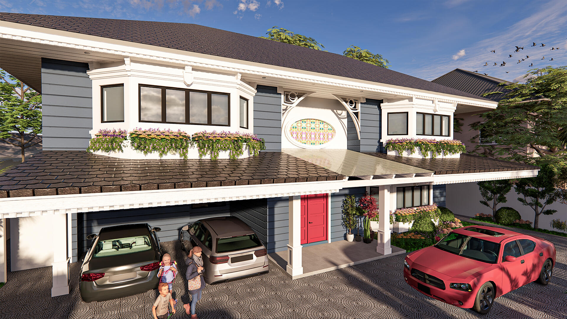This modern country house is a two-storey residential property with loft. The 140 sqm.house includes 4 bedrooms, 4.5 toilet & baths, an indoor garden, open loft space, and parking for two cars. The design maximizes scale utilization, creating an illusion of spaciousness.