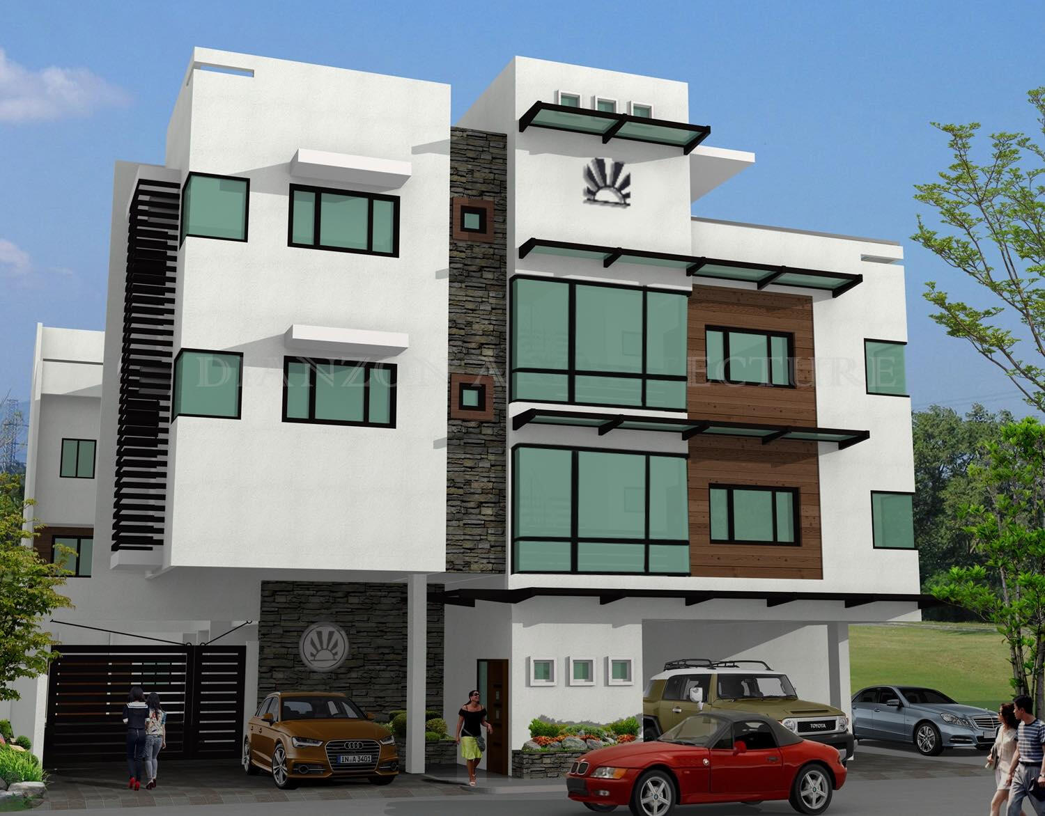 A contemporary four-story apartment complex comprising three units. Each unit offers four bedrooms, three bathrooms, a two-car covered garage, and two viewing balconies.