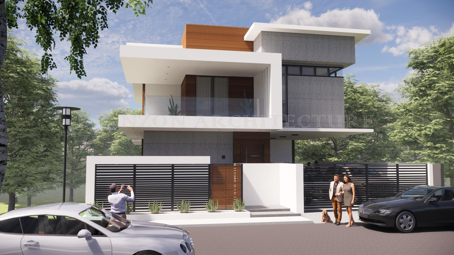 The architectural design features a two-storey smart home characterized by interconnected blocks that create a cohesive structure. Notably, the varying window sizes correspond to the specific functions of each block. The prominent concrete parapet contributes to the visual impression of a roof deck.