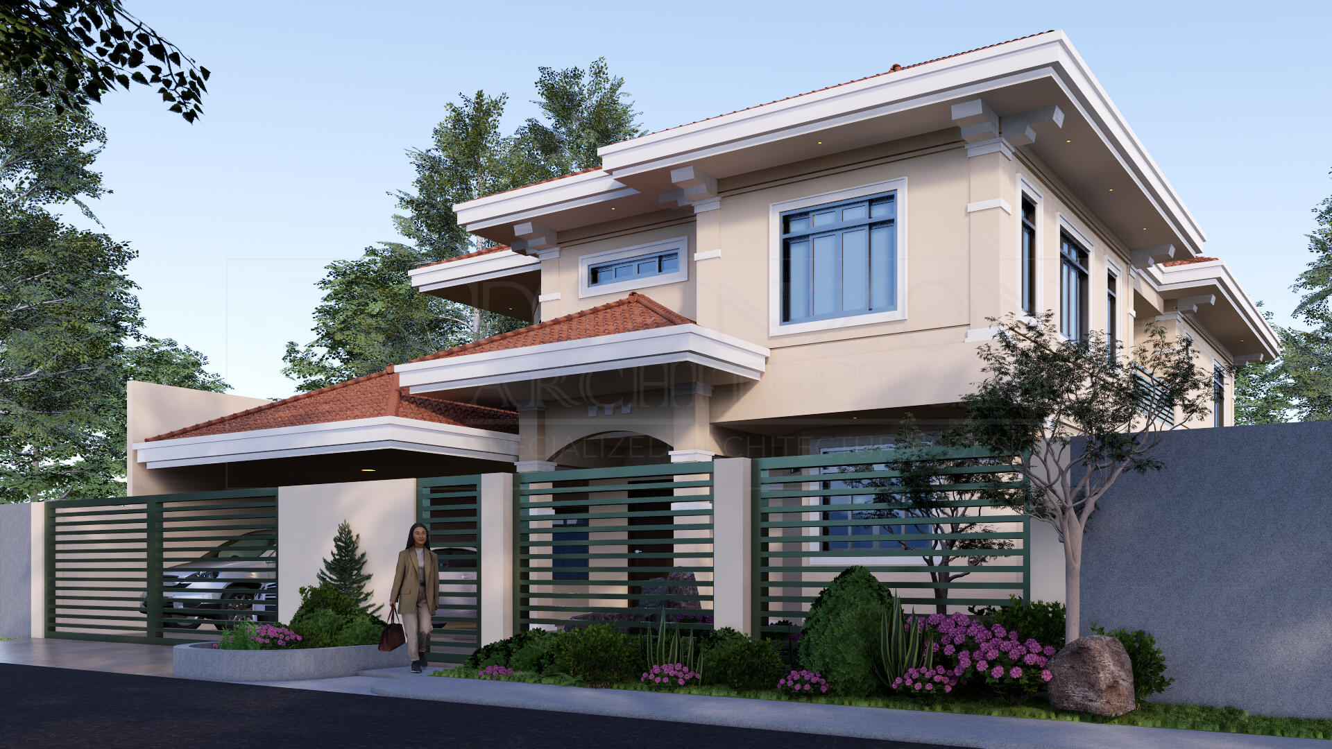 A two-storey Mediterranean-style residence showcases the prevalent use of painted clay bricks for the walls, handcrafted concrete frames and mouldings, and a Spanish clay-tiled roof representing a revival of a genuine Architectural classic.